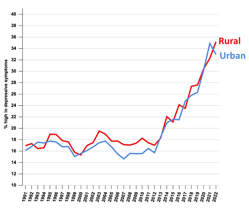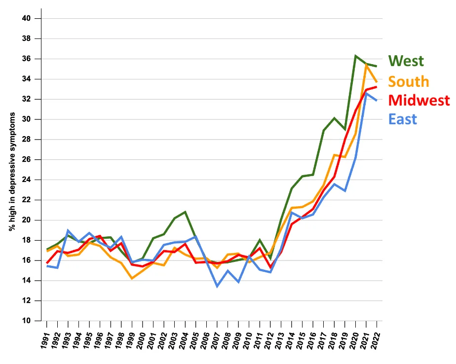 The most prominent difference can be found between boys and girls (smart phones have had a far more disastrous impact on girls’ mental health):