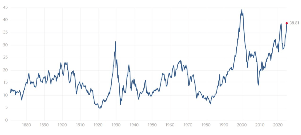 U.S. stocks (the S&P 500) have taken out the 2021 bubble high in the CAPE price to earnings ratio. U.S. stocks are now more expensive than any moment in history, outside a brief period around the 2000 tech bubble peak:
