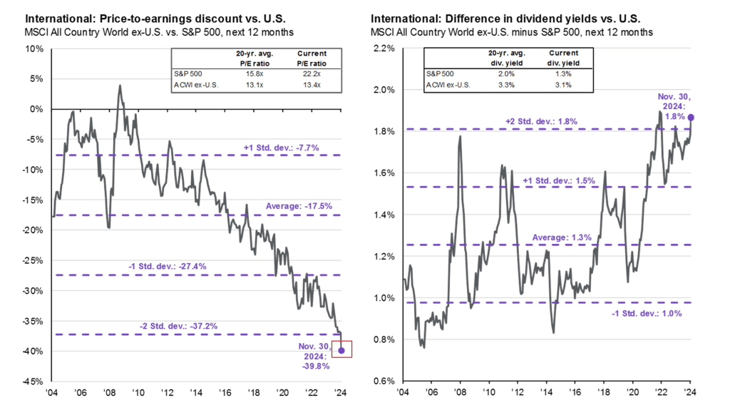 The price to earnings ratio for companies outside the U.S. relative to the S&P 500 (U.S. companies) continues to diverge dramatically (chart on the left below showing how undervalued foreign stocks are relative to U.S. stocks). In addition, the income you receive (dividends) for holding foreign stocks continues to increase relative to U.S. companies (the chart on the right):