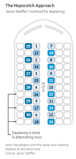 The fastest way to deplane, Steffen says, is to employ this boarding method in reverse. Under the current row-by-row method, an entire plane full of people might end up waiting for one person who struggles to take down or manage luggage. The alternating row method would allow more travelers to step into the aisle and take their bags.