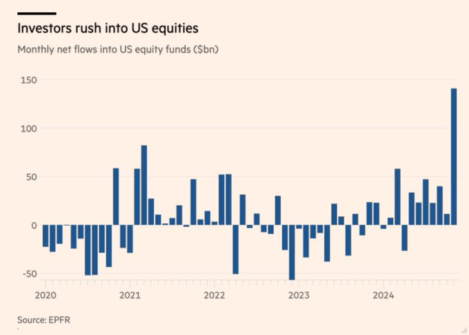 The monthly inflows into U.S. stocks in November were the highest since the peak of the tech bubble in 2000.