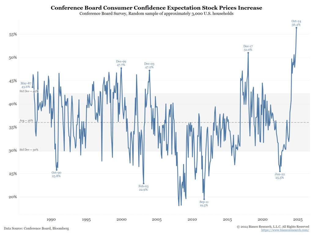 The percentage of respondents that expect U.S. stocks to rise over the next 12 months. New record-shattering levels of bullish excitement: