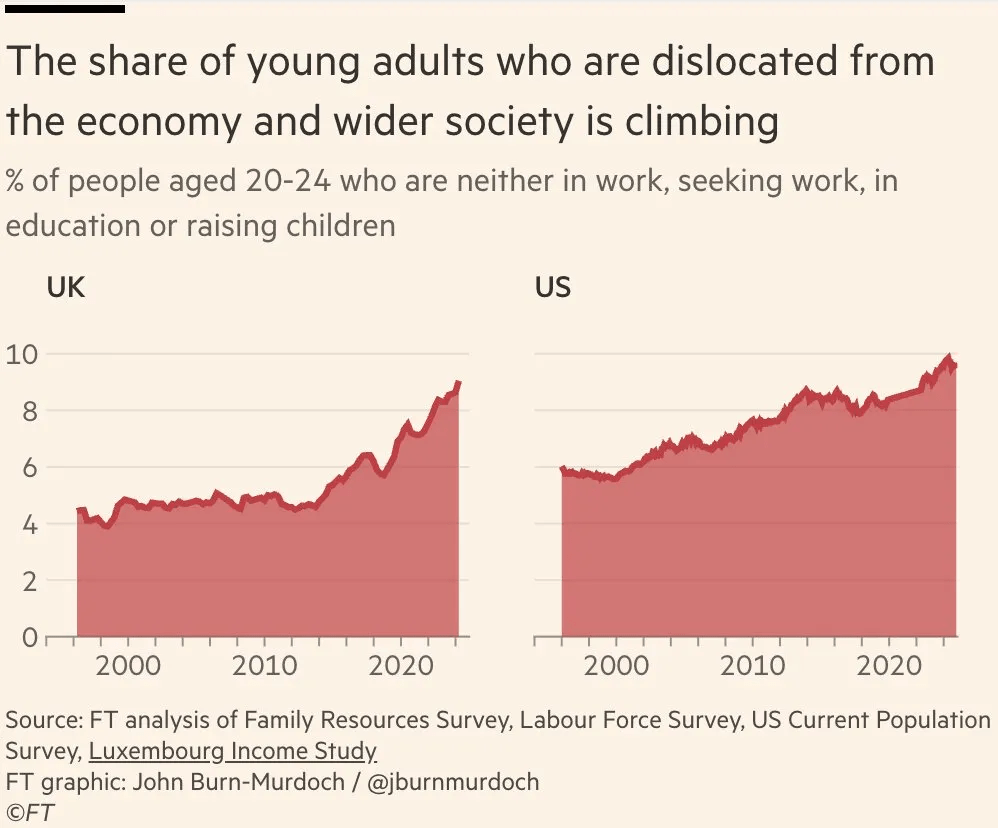 The share of people between 20 and 24 who are not in a job, or seeking work, or in school, or raising a child has nearly doubled in the last quarter-century in both the UK and the U.S.