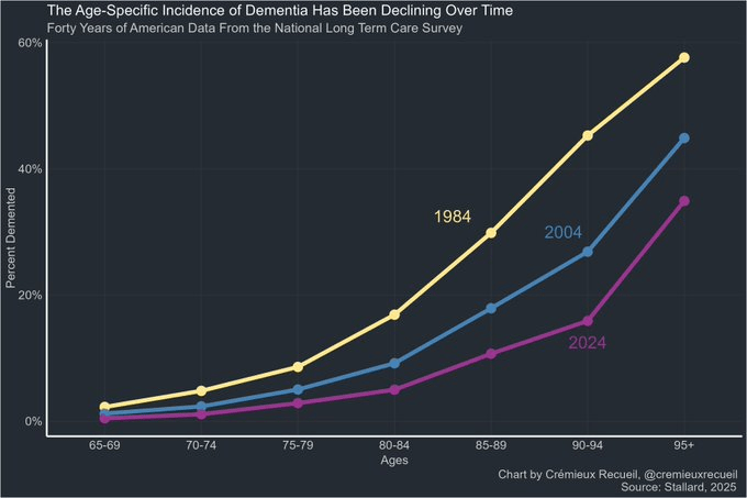 One of most exciting longevity trends right now is the decline in dementia. At a given age—70, 75, 80, etc.—the prevalence of dementia is down compared to what it was decades ago. Today’s 90-year-olds have less than half the risk of dementia that ones in 1984 did.