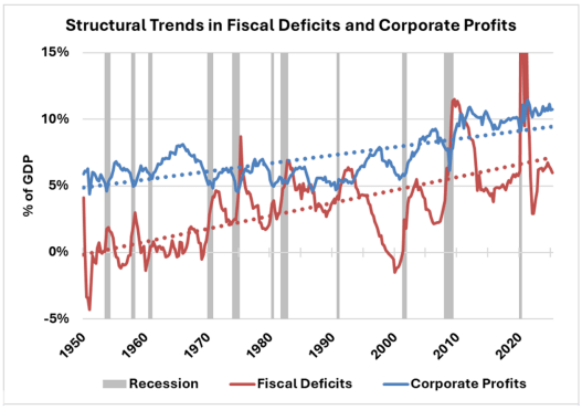 The foundation supporting U.S. corporate profits and equity valuations has weakened, leaving the market increasingly fragile. Profits now depend on large-scale fiscal deficits, a sharp departure from the mid-century model when profits were generated by private investment of retained earnings.