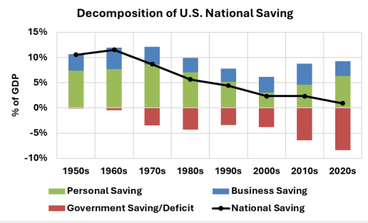 1. The collapse of national saving. In the 1950s and 1960s, net domestic investment, funded entirely by national saving, averaged 11% of GDP. But then structural fiscal deficits started to offset private saving, and national saving has now collapsed to nearly zero.