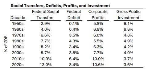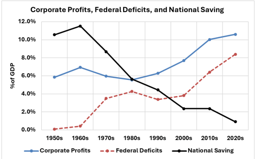 4. The financialization of profits. As deficits soared from near zero in the 1960s to 8% of GDP by the 2020s, the profit share grew in parallel, from 6% of GDP to more than 10%. Over this same time, national saving collapsed from 11% of GDP to near zero.