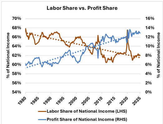 5. Growing inequality as a consequence. Because the profit share of GDP grew, the labor share necessarily shrank. Even as social transfers soared by 10% as a percentage of GDP, the labor share of national income entered a prolonged decline, falling from near 68% in the early 1980s to 62% by the mid 2020s. And because the rising profits accrue mostly to wealthy households, who don’t spend much in the real economy, this further fuels the cycle of recycling profits into financial assets.