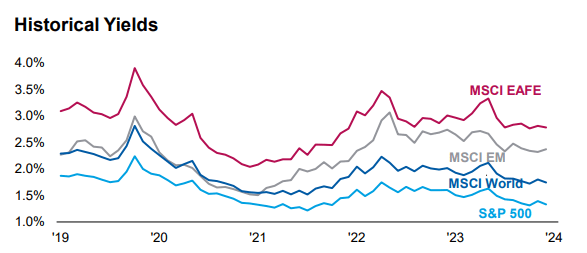 The following graphs show the dividend yields for the S&P 500, MSCI World (all developed stock markets including the U.S.), MSCI EM (emerging markets) and MSCI EAFE (developed markets excluding the U.S.).