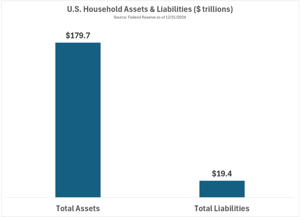 The federal government has a bit over $36 trillion in debt. To put that in context, US households collectively have $180 trillion in assets, or $160 trillion in net worth after liabilities (mostly mortgages) are subtracted.